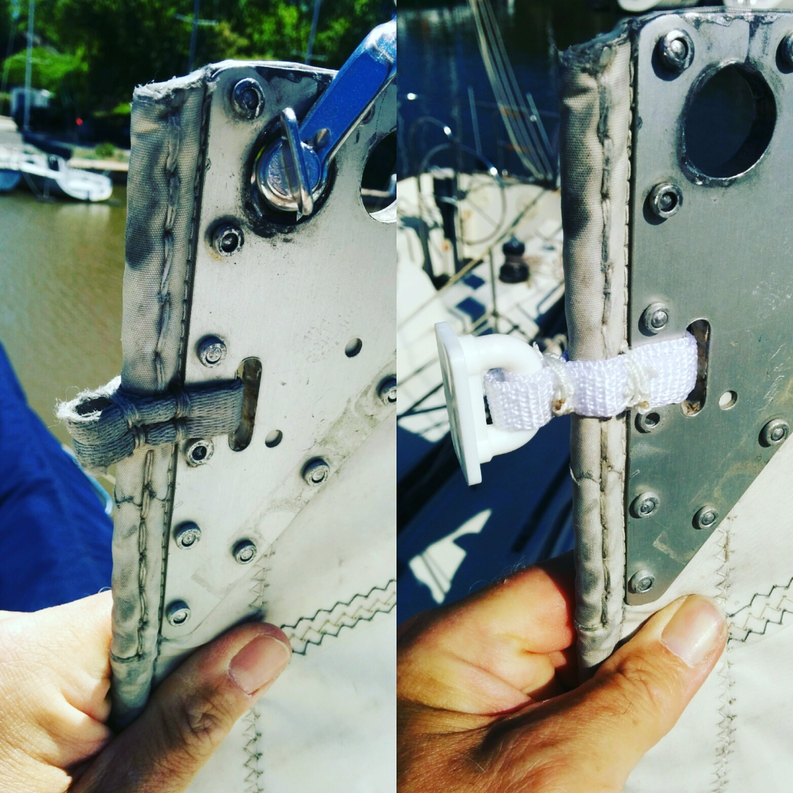 When I returned from my round the island sail two weeks ago, I noticed I had broken the top sail slide. Not a big deal, but the head of the sail has a metal plate and the slide doesnt attach the same way as the other slides.